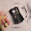 This elegant gift set combines a Personalized pen and keychain, making it a thoughtful present for any occasion. Both items are crafted with a sleek black finish and feature a unique design element – a clear cylinder filled with golden flakes. This adds a touch of luxury and visual appeal.